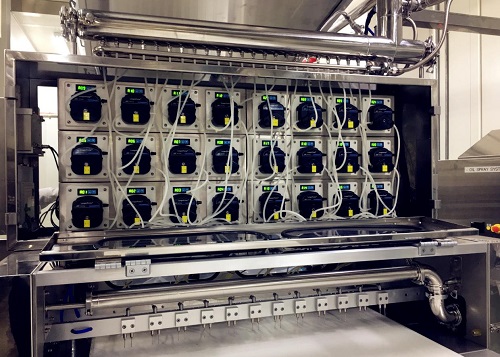 In the automated production line of baked goods, a 6-group peristaltic pump filling system, paired with YZ15 pump heads, forms a 24-channel flavor oil injection system. During the production process, it evenly applies food flavor oils onto the food to be processed. The peristaltic pump filling system's high-precision liquid distribution ensures that the products on the production line meet the quality and R&D process standards, while the automated linkage control function helps users achieve efficient production.